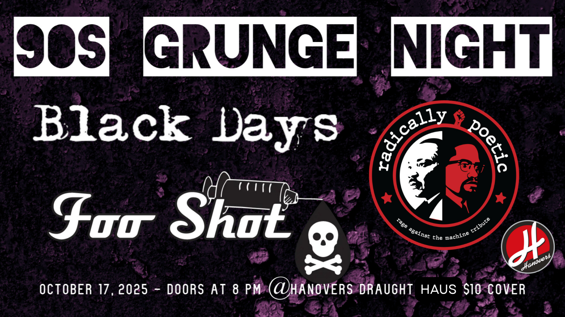 17oct(oct 17)8:00 PM18(oct 18)1:00 AMFeaturedGrunge Night with Black Days + Friends90s Grunge Night returns to Hanover's with ATX's best tributes to grunge and 90s rock on Friday, October 17th! $10 GA Ticket Entry