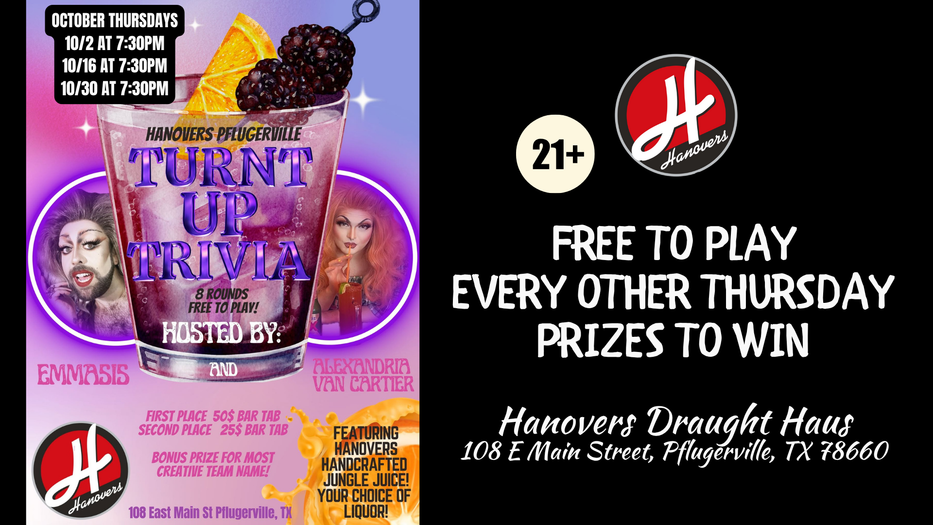 30oct7:30 PM9:00 PMFeaturedTurnt Up Trivia NightHanovers Trivia Night gets a MAJOR UPGRADE with Emma Sis & Alexandria Van Cartier! 8 Free Rounds of Trivia TURNT UP to challenge YOU!