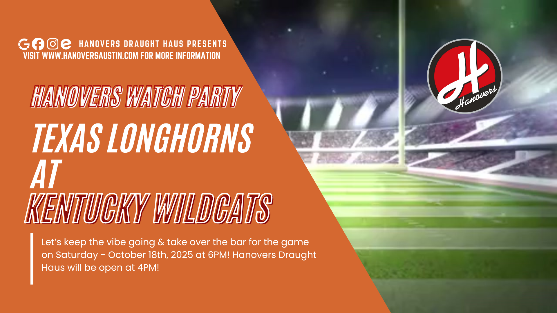 18oct6:00 PM10:00 PMFeaturedUT Longhorn vs Kentucky Wildcats Watch PartyLonghorn fans! Unite on the Hanovers Outside Deck area to go up against the Kentucky Wildcats! We want to see those burnt orange jersey!