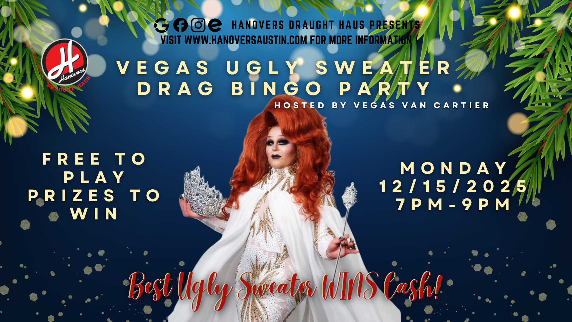15dec7:00 PM9:00 PMFeaturedVegas Ugly Sweater Drag Bingo PartyThe winter chills is upon us & Vegas Van Cartier is awarding the UGLIEST X-MAS SWEATER the greatest respect of a CASH PRIZE! Free to Play!